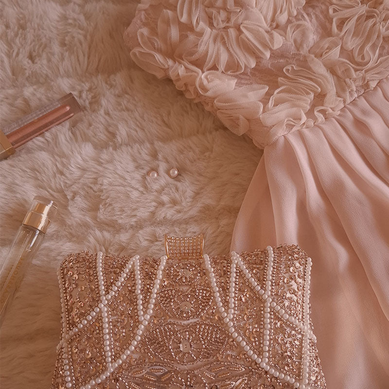 A floral masterpiece in motion – the Rose Chic Petal Clutch is a vision of sculpted beauty, its delicate layers mirroring the soft curves of a blooming rose.