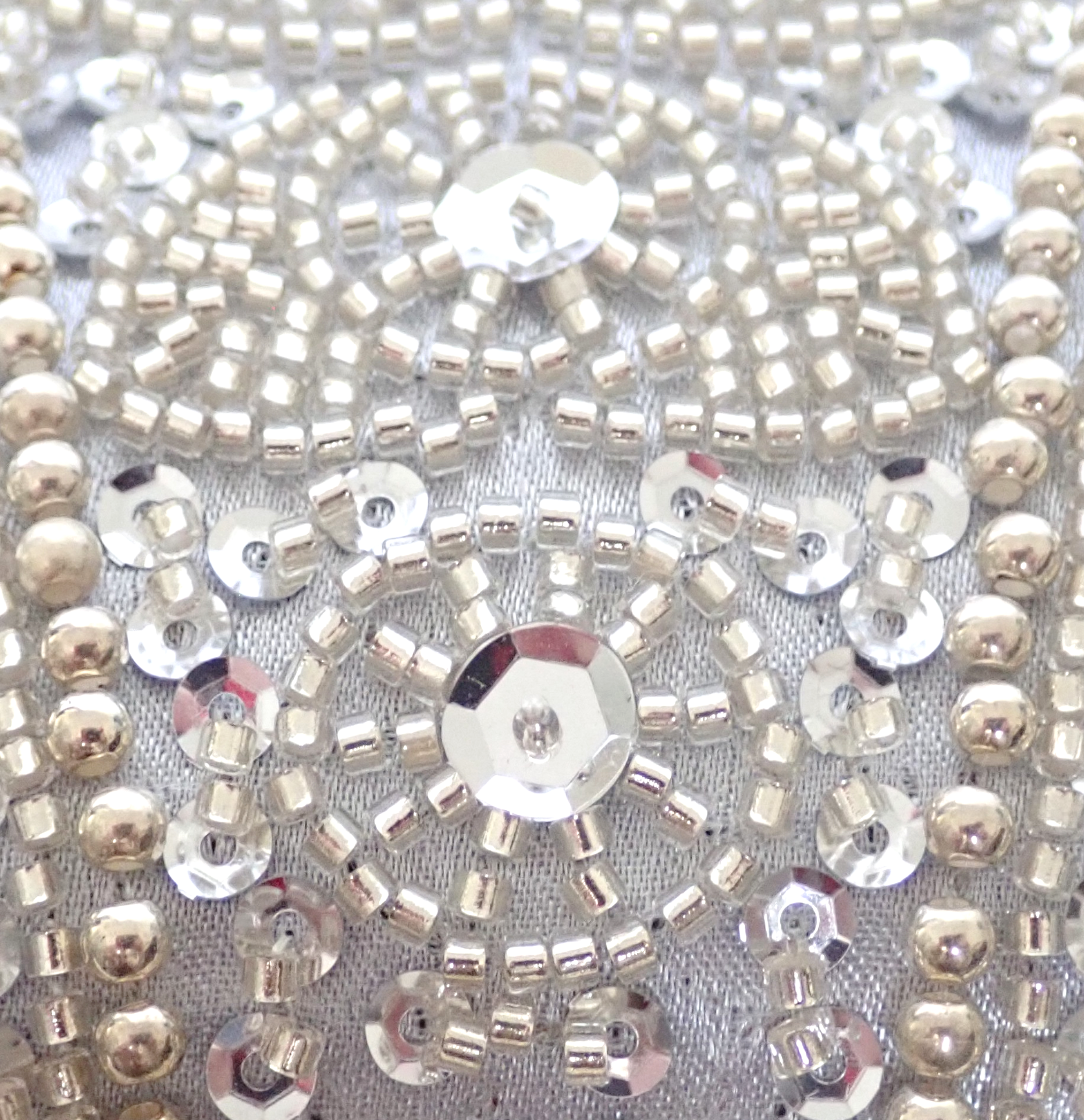 Intricately adorned with silver pearls, delicate beadwork, and shimmering sequins, this clutch evokes the charm of vintage craftsmanship with its ornate beaded patterns. The gold-tone hasp closure, crowned with crystal embellishments, adds a luminous accent, while the lustrous silver satin back ensures both beauty and protection – preserving the flawless elegance of your ensemble.