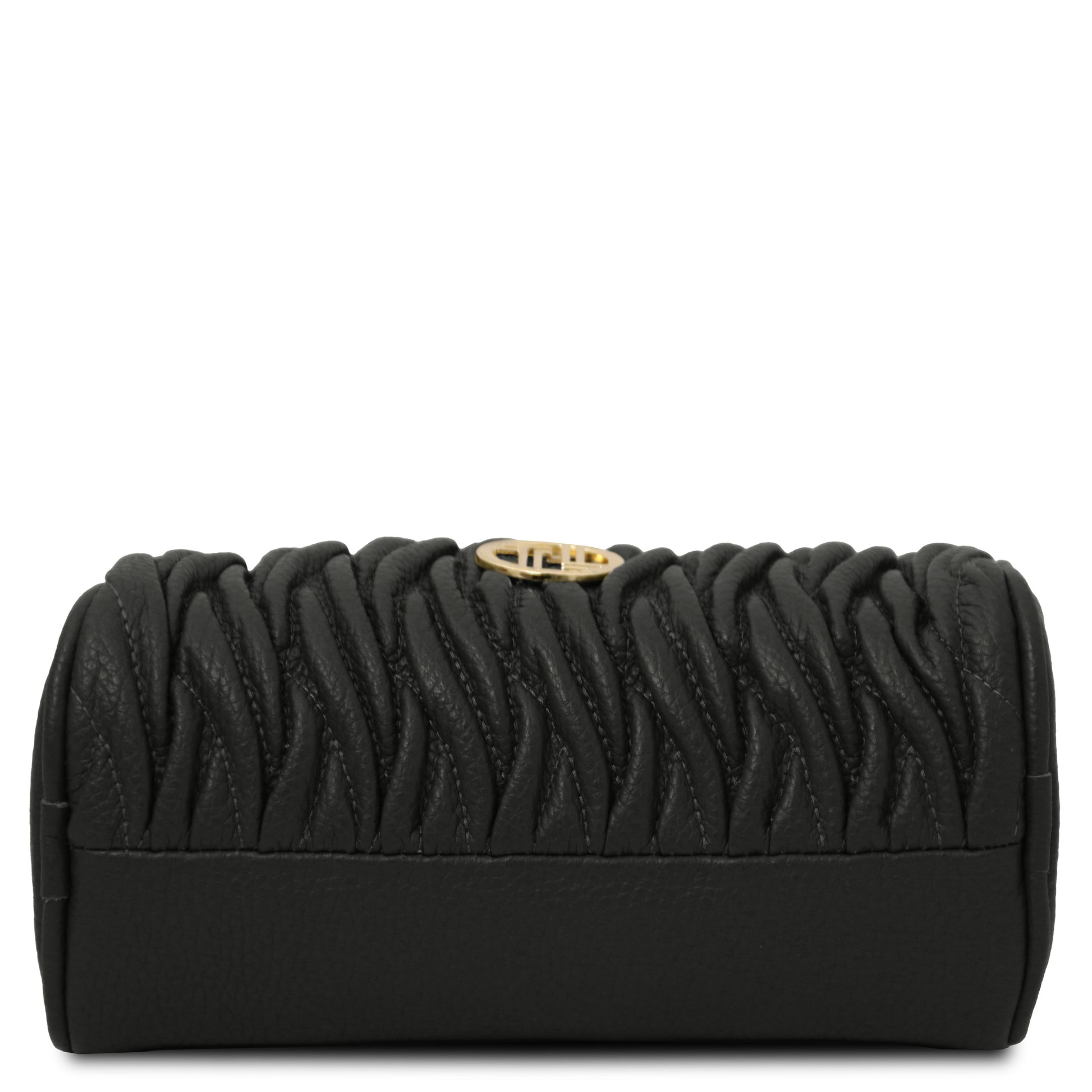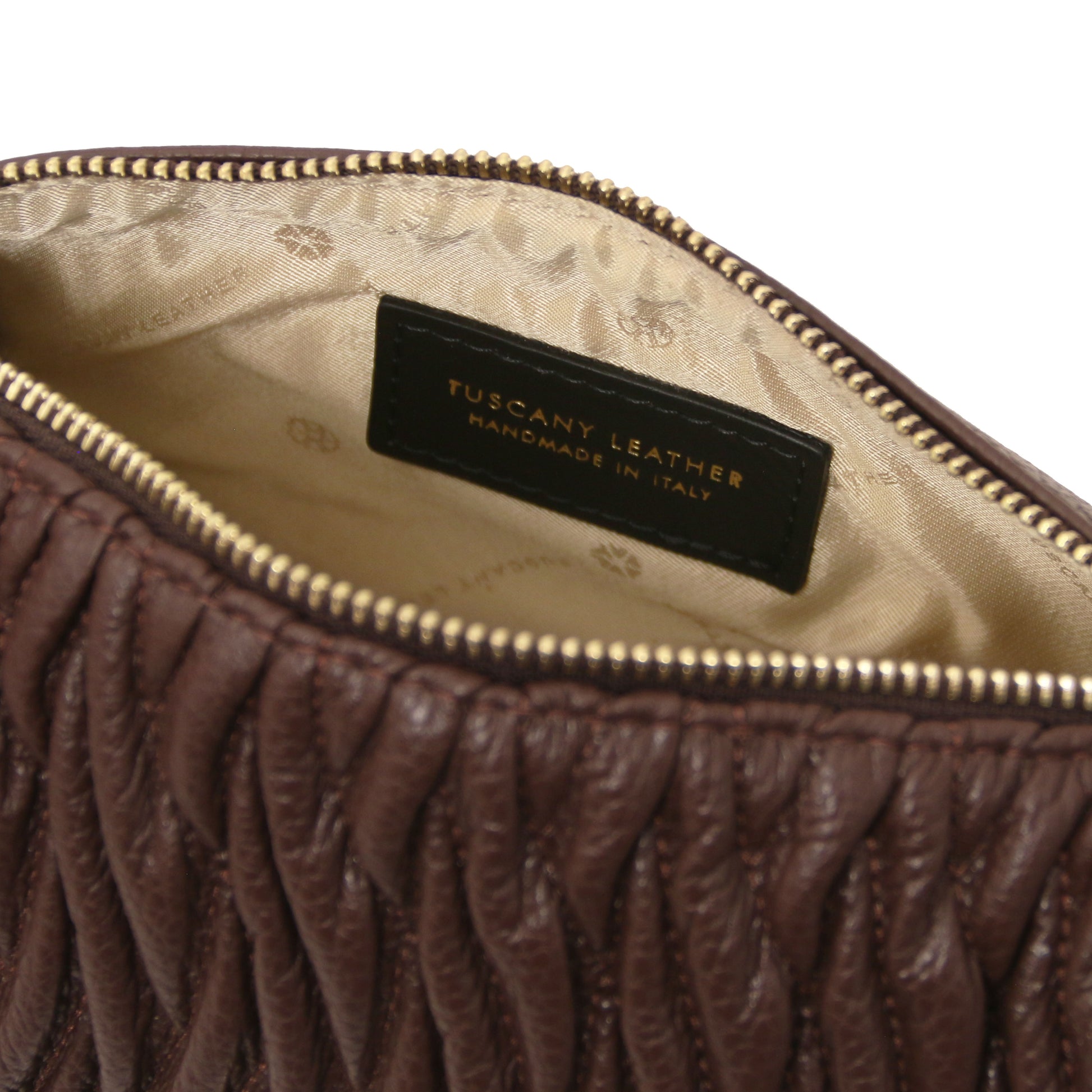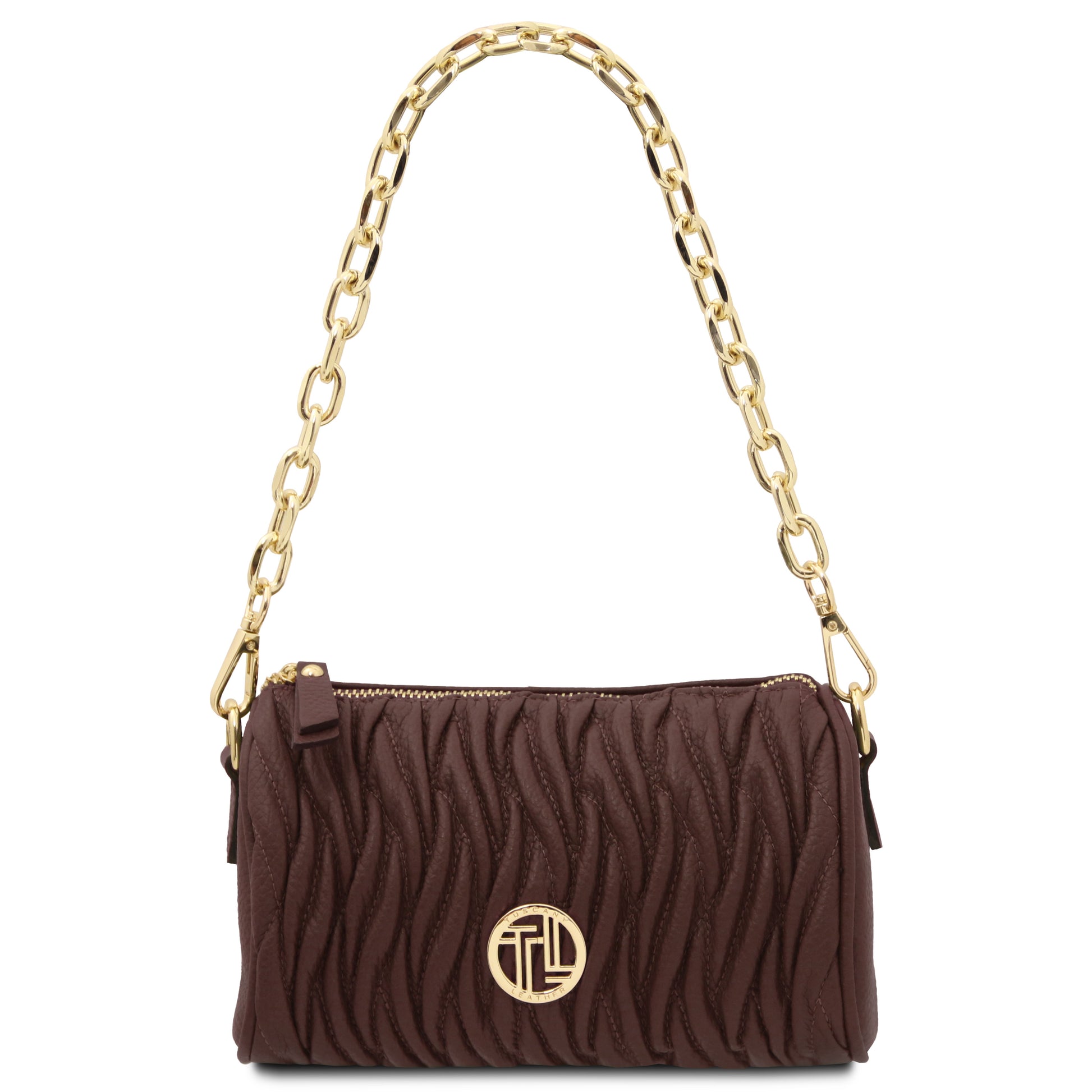 Compact, Glamorous, Versatile – The Chantilly Mini Leather Clutch blends pebbled Italian leather with a wave-ruched front and a bold gold chain handle for a chic 70s-inspired look with modern sport-luxe ease.