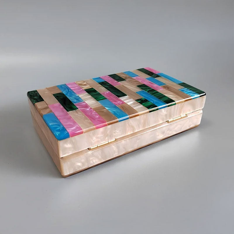 A modern take on the acrylic clutch, this piece mixes soft lilac, emerald green, sky blue and sand-beige in a glossy mosaic that glows like mother-of-pearl – a statement clutch that feels both energising and zen-chic.