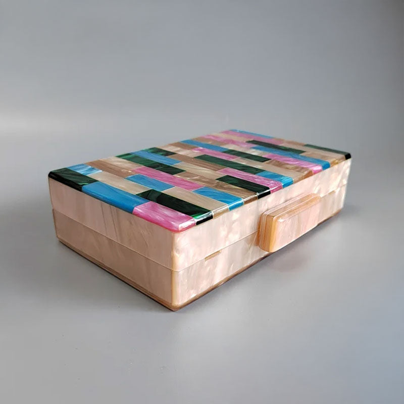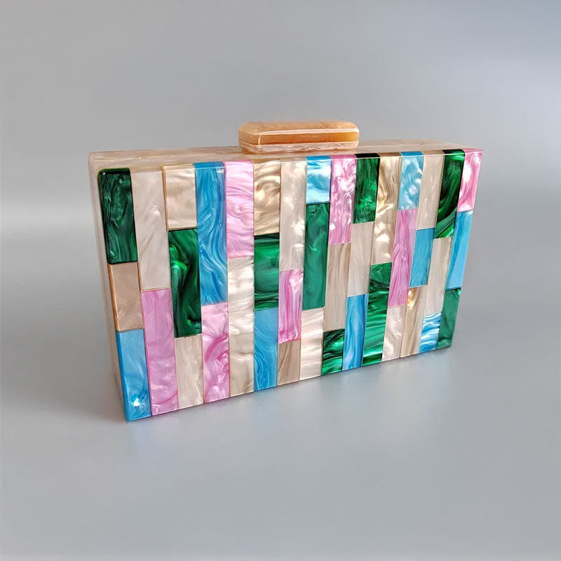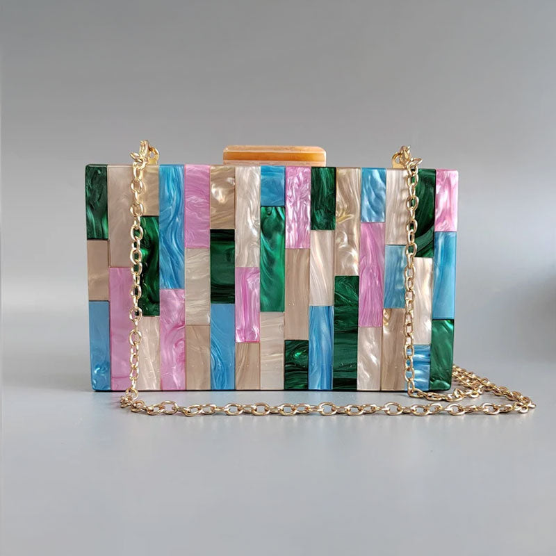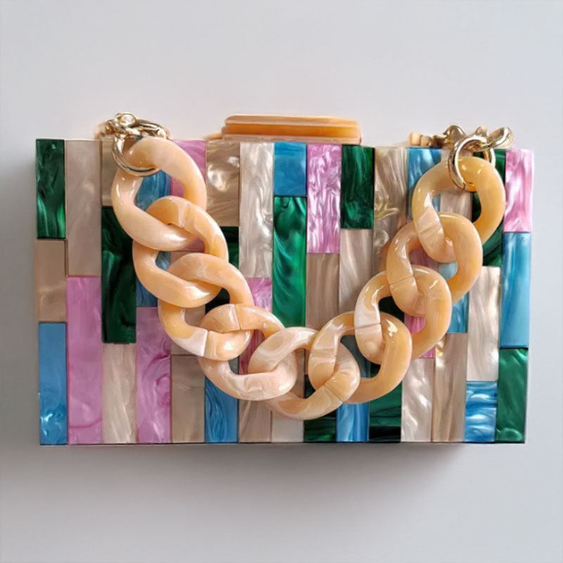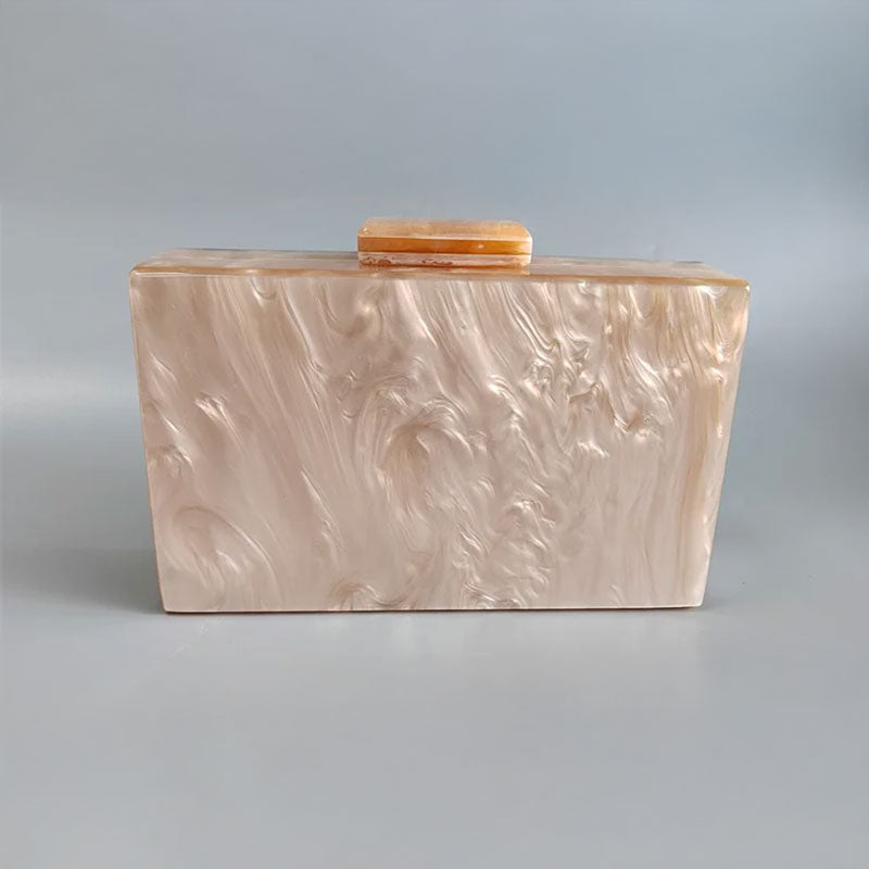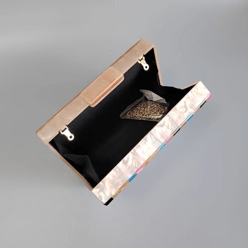 Colour, shine, and easy glamour – a pearl-effect acrylic clutch that turns moments into memories.