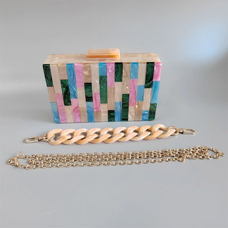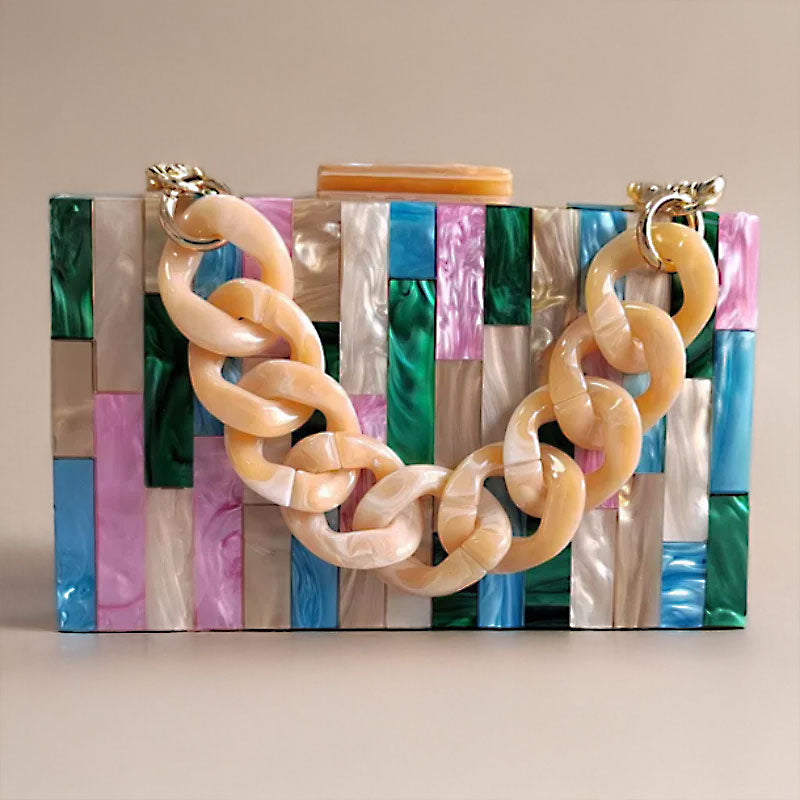 Vibrant, Playful, Resort-Chic – The Oasis Mosaic Acrylic Clutch brings a colour-splash mood to Oasis Lush with pearl-sheen tiles and a chic beige acrylic chain for effortless statement style.