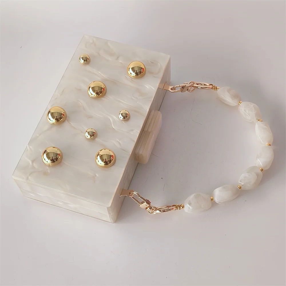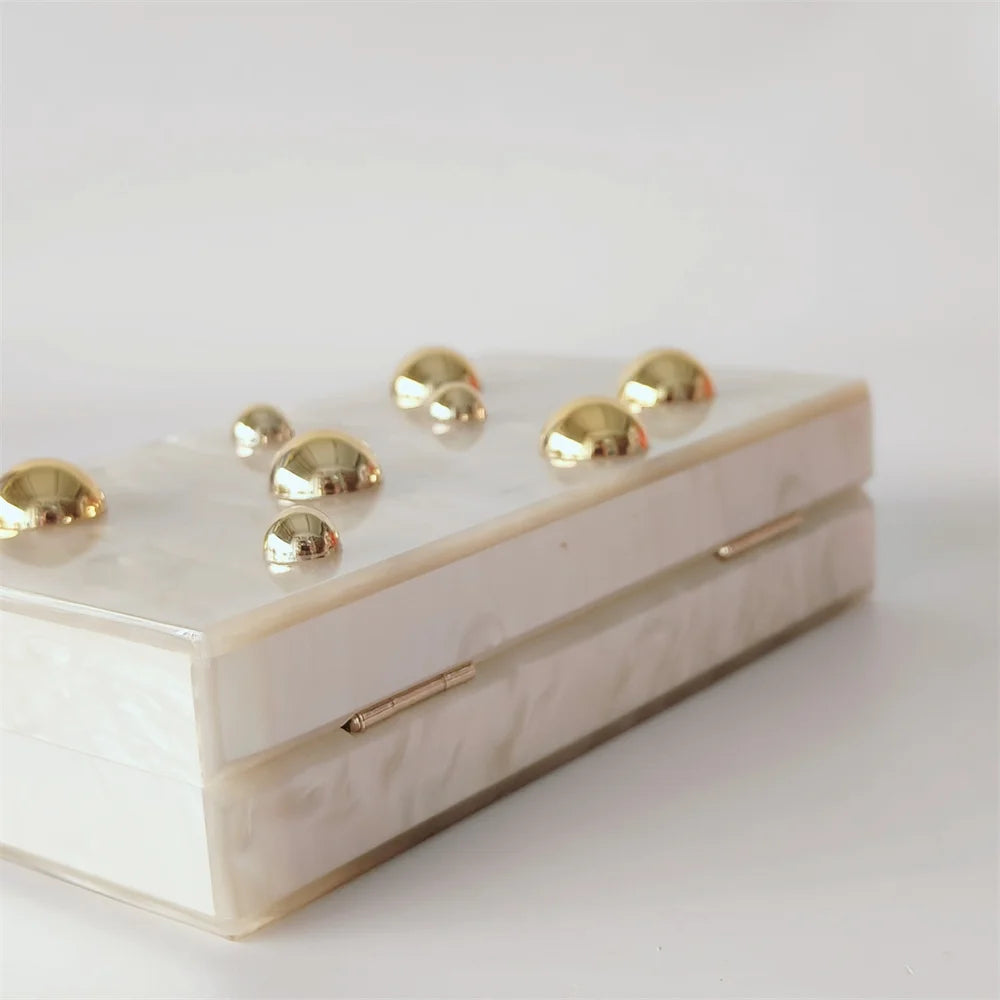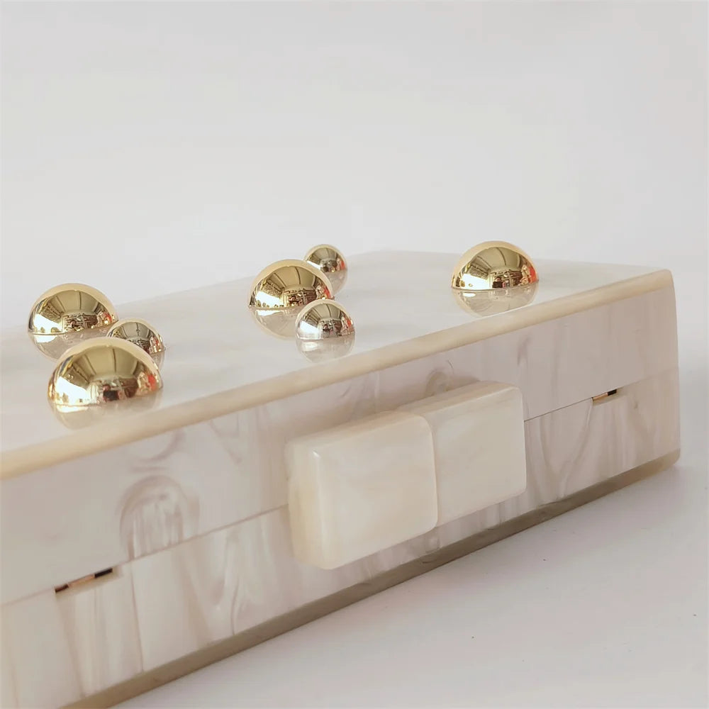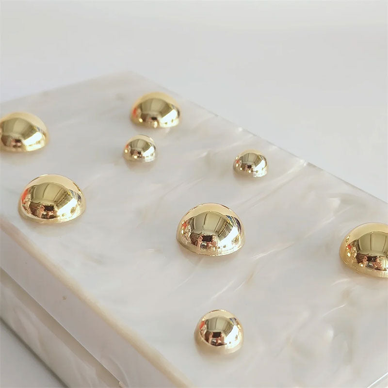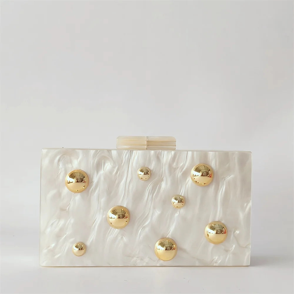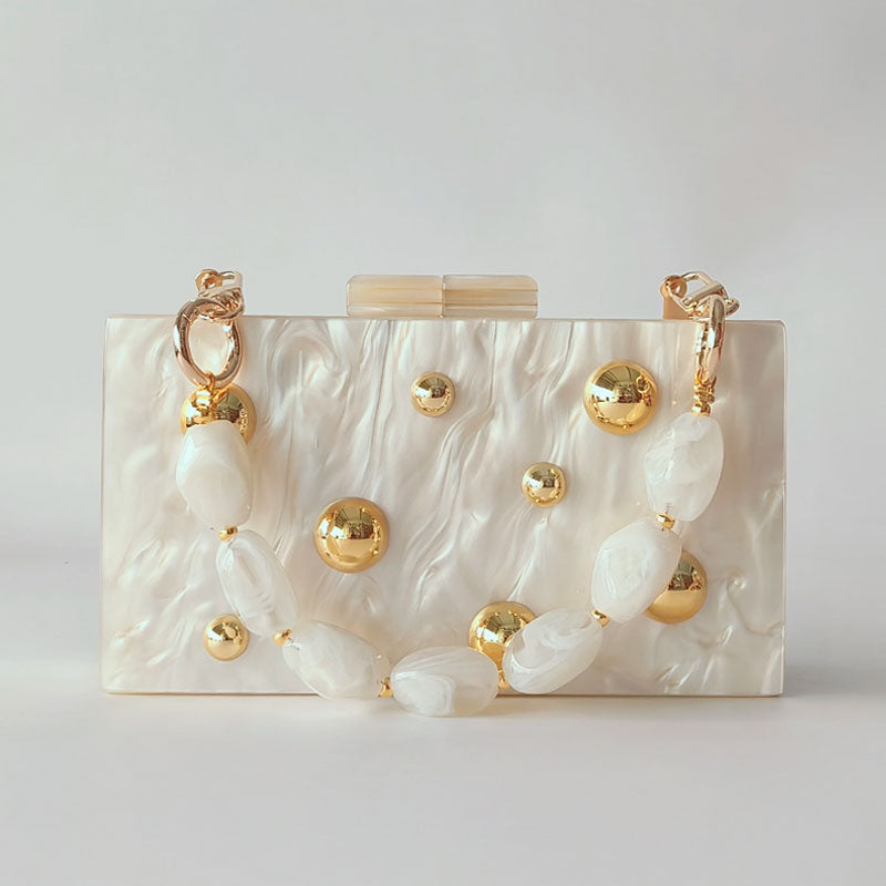 Modern, Sculptural, Radiant – The Pearl Dot Acrylic Clutch pairs a luminous ivory pearl-sheen body with glowing gold domes and a chic beaded handle for a look that’s artful, elegant, and effortlessly statement-making.