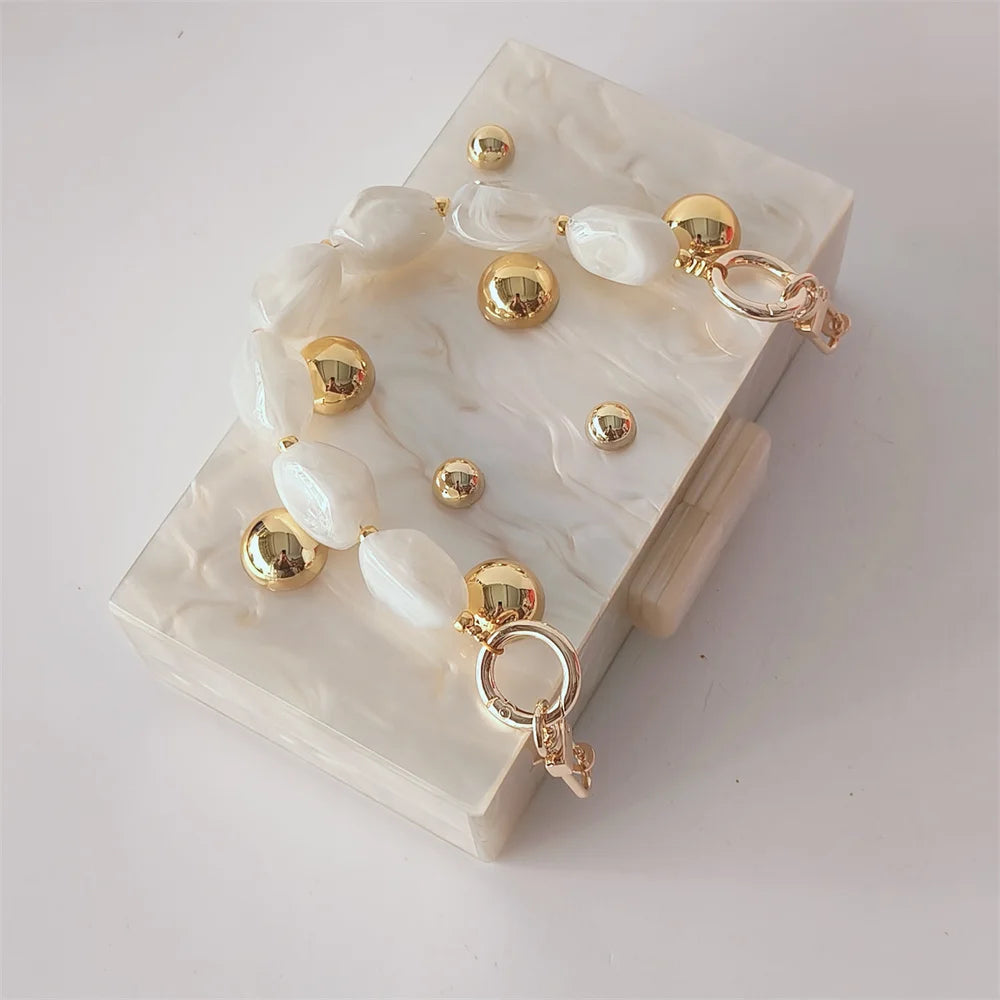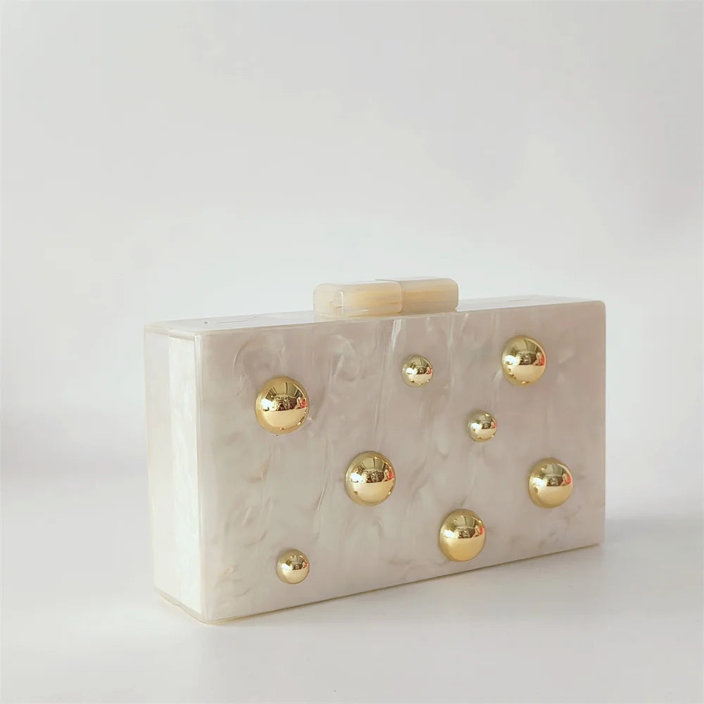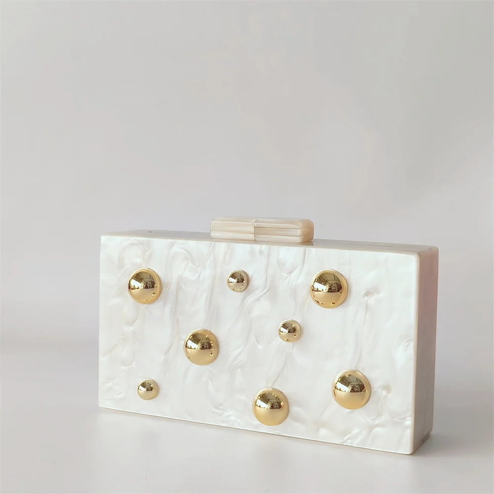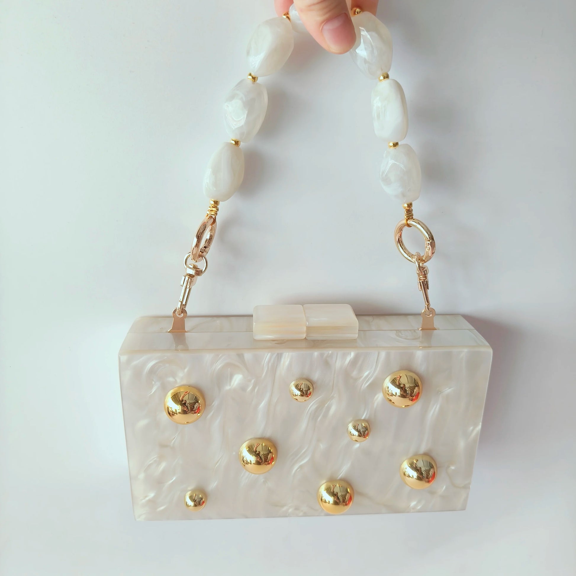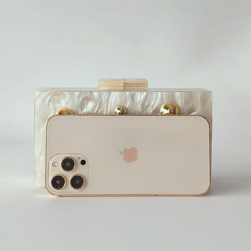 Modern, Sculptural, Radiant – The Pearl Dot Acrylic Clutch pairs a luminous ivory pearl-sheen body with glowing gold domes and a chic beaded handle for a look that’s artful, elegant, and effortlessly statement-making.