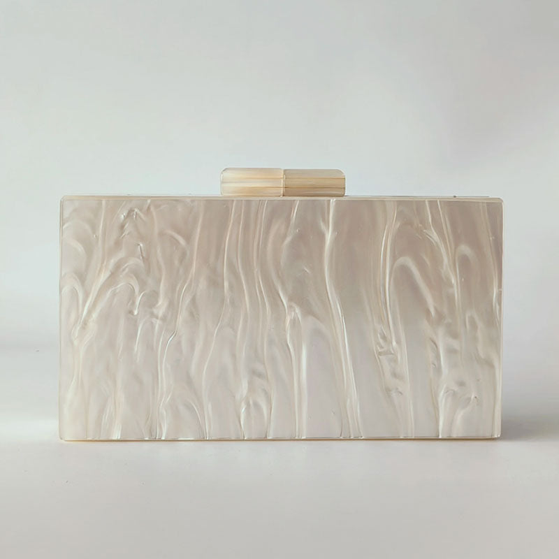 Like sunlight on sea foam, its mother-of-pearl texture ripples softly while polished gold “drops” create a refined, modern pattern. Minimal in shape yet rich in detail, this ivory acrylic clutch adds instant polish to everything from sleek tailoring to romantic dresses.